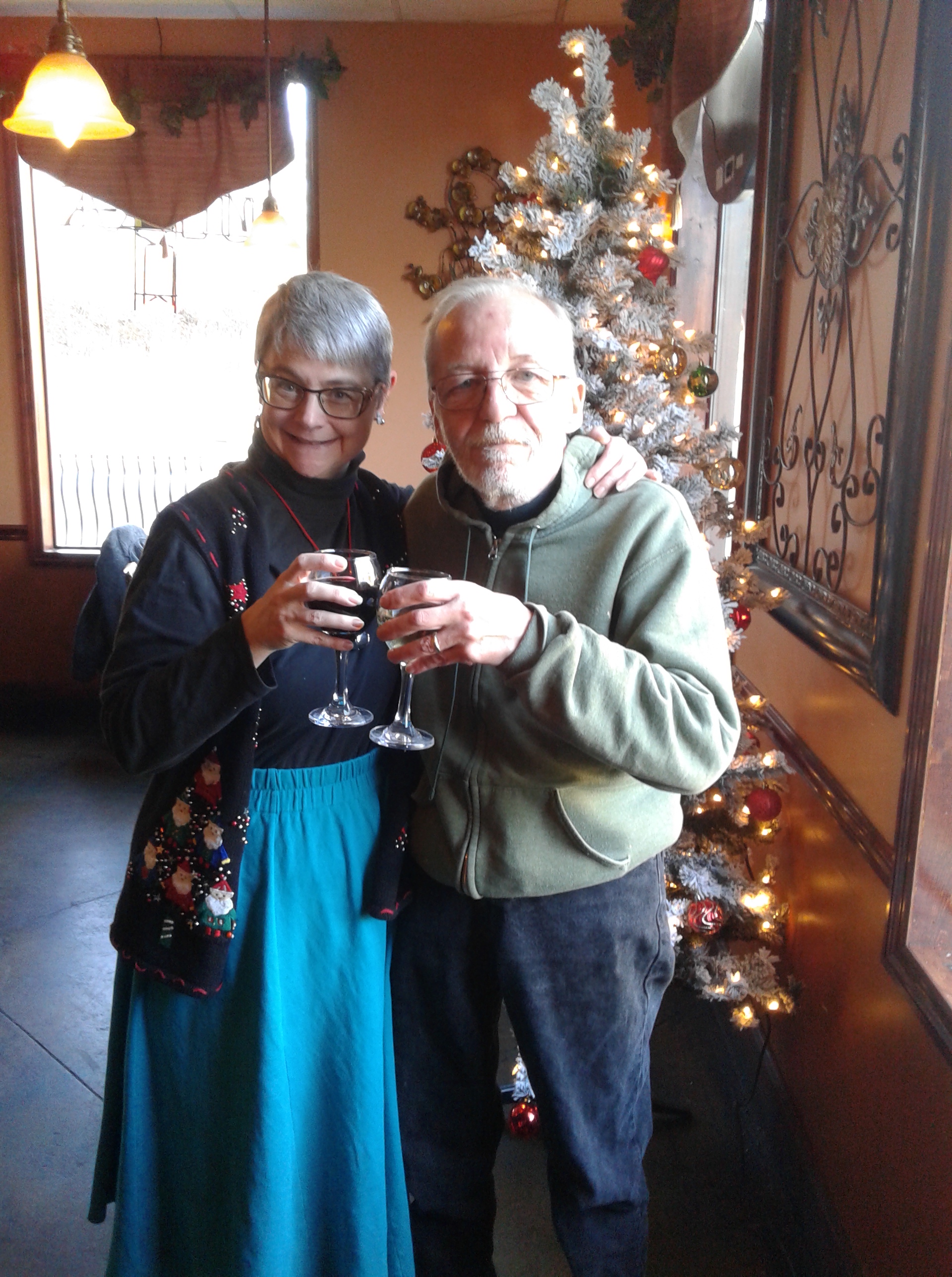 I close with a picture of myself with my late, dearly missed husband Steve.  We were at Salvatore’s in Herkimer, one of our favorite places to eat.  I have not been there in a while.  I do not think they are open on Sunday, but perhaps tomorrow I could stop in for lunch or dinner.  Maybe I will even wear the vest I have on in the picture.