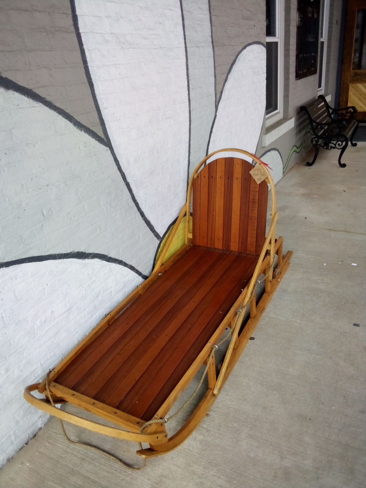 Accordingly, I drove to Little Falls this morning.  My first stop was at Chickweed Boutique on Main Street.  There was a wonderful handmade sled on the front porch.