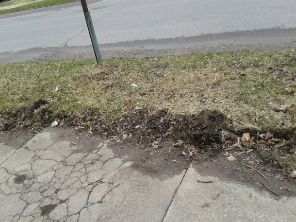 While I was out front, I took a picture of what the sidewalk plow did to us, and to almost everybody else in the village. I had wanted a “before” picture of that, so when I fix it I can see what a good job I did (or not, let’s be honest).