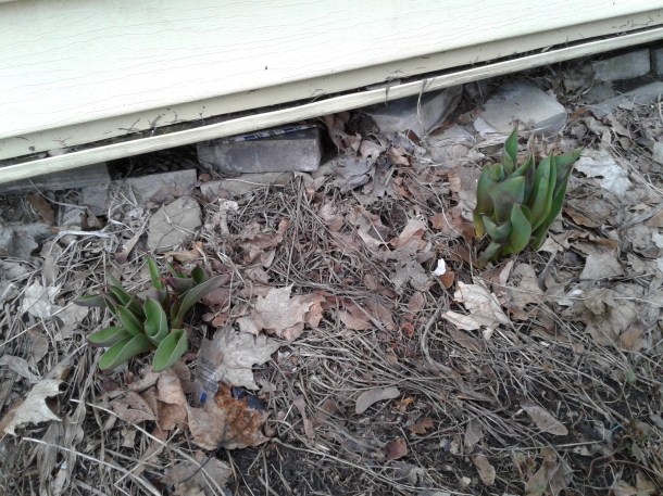I went out front, to see if there were any more crocuses. There were not, but I saw some green stuff that might eventually be tulips and lilies of the valley.