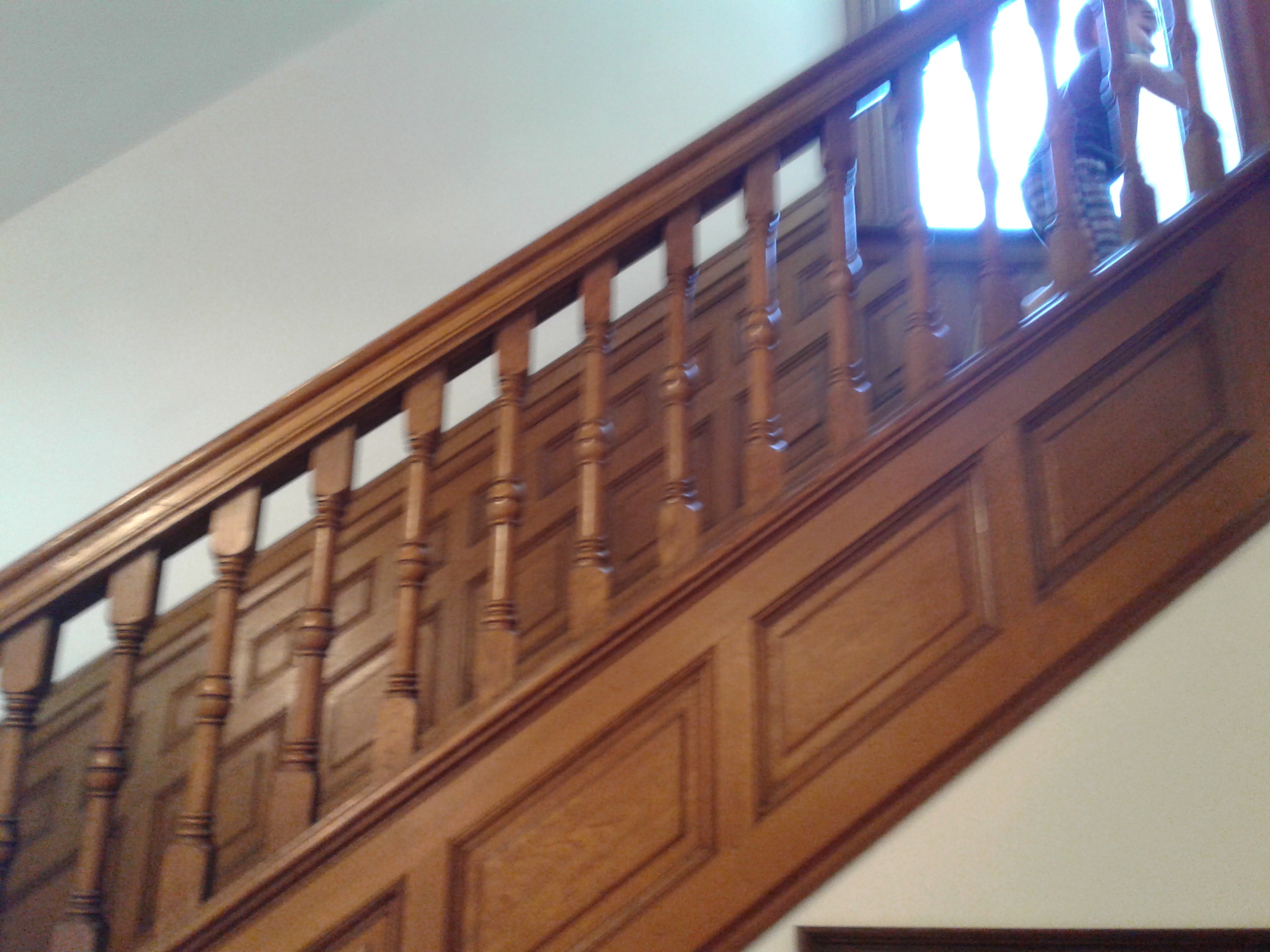 The mystery took us upstairs. I always stop and admire the woodwork, but Sheppie was more interested in getting up those stairs and finding more answers.