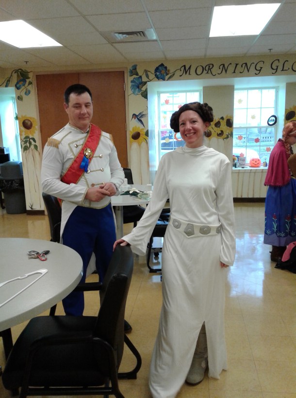 Unfortunately I could only take pictures in the room where we hung out before the event. During the event, I was busy dancing, signing autographs (really!), and generally being a character once the event started. But I think my backstage pictures are fun. In the above shot, the foreground features Alice of Alice in Wonderland with one of the Queen of Hearts’ minions (I know you think a minion is a goofy yellow guy in a Facebook meme, but it is also a generic term for an underling). The Beast from Beauty and is in the background, without his head.