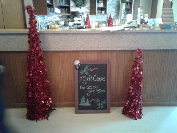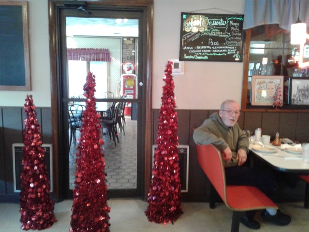 In the midst of our pre-Christmas gyrations, Steven and I found time for breakfast at The Knight Spot in Frankfort, NY. We had a tasty meal, and I took a couple of pictures of their Christmas decorations.