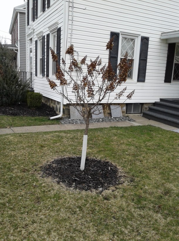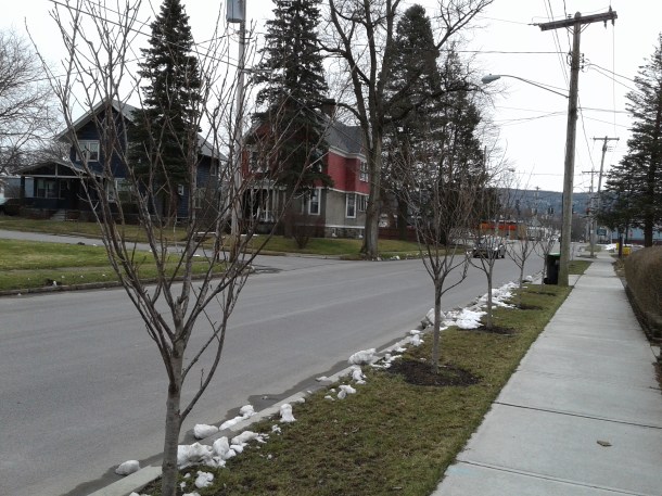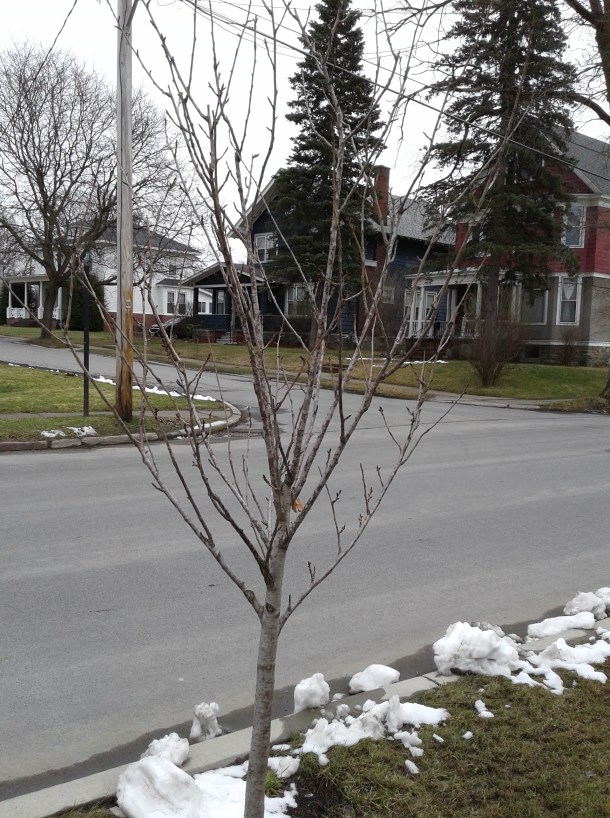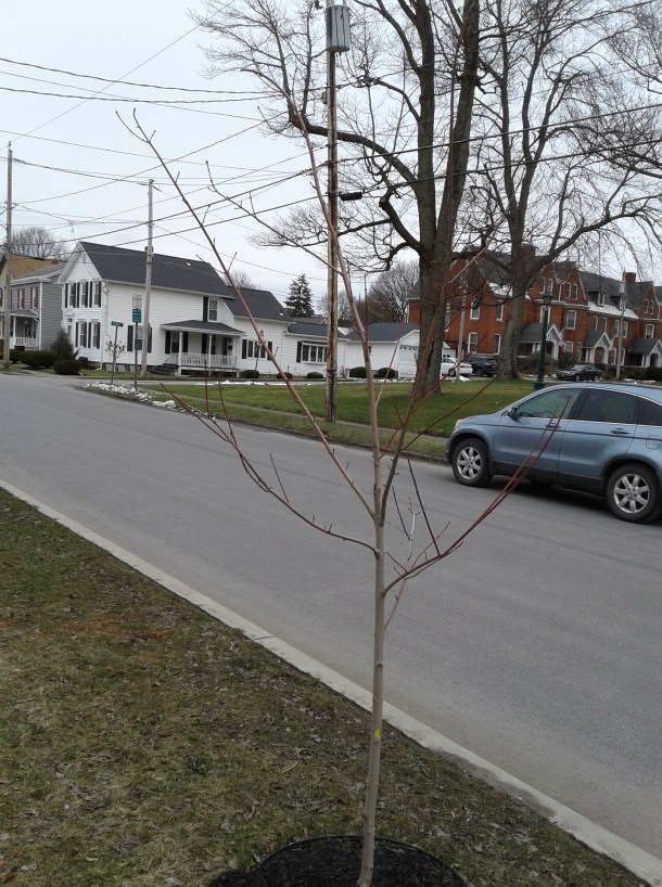 On my way home from the post office, I noticed some recently planted trees on Bellinger Street. I took pictures. My hope is to take more as the year progresses so we can track their progress.