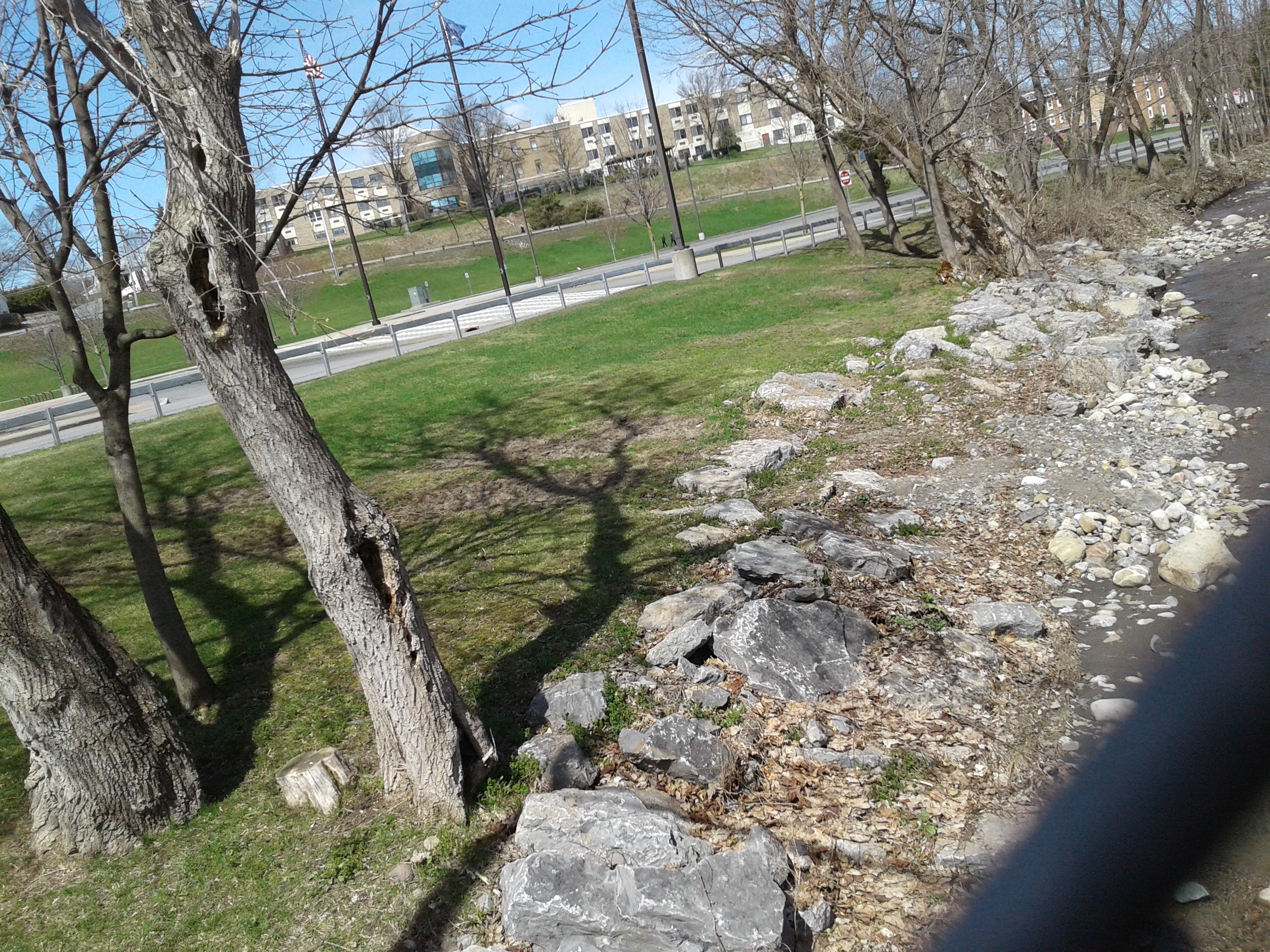 Yesterday I was writing about a walk I took.  I left off with some daffodils.  Next I walked over to the high school, which was right across the street.  Running along one side of the parking lot and behind the school is a stream.  I tried to get a good picture.