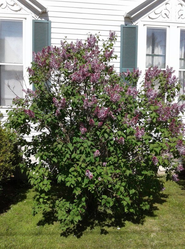 I got about two houses down the street when my knees started in. What the hell, me? I turned around, thinking I could at least take some pictures at my own house. First I crossed the street to take a picture of the lilac bush in front of a neighbor’s house.