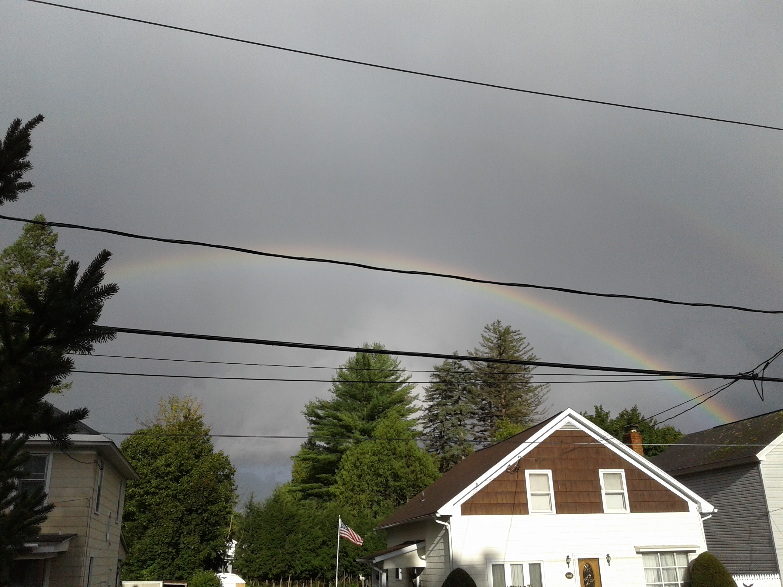 One thing I do have is a couple of pictures to share.  Shortly after I got home last night, my husband, Steven called from the porch, “Look, a rainbow!”  I had not even realized it was raining.  These days the Mohawk Valley is really embodying the saying, “If you don’t like the weather, wait five minutes.”  It was not only raining, the sun was still shining.  Score!  When I saw there was a double rainbow, I got the Tablet and tried to capture the moment.