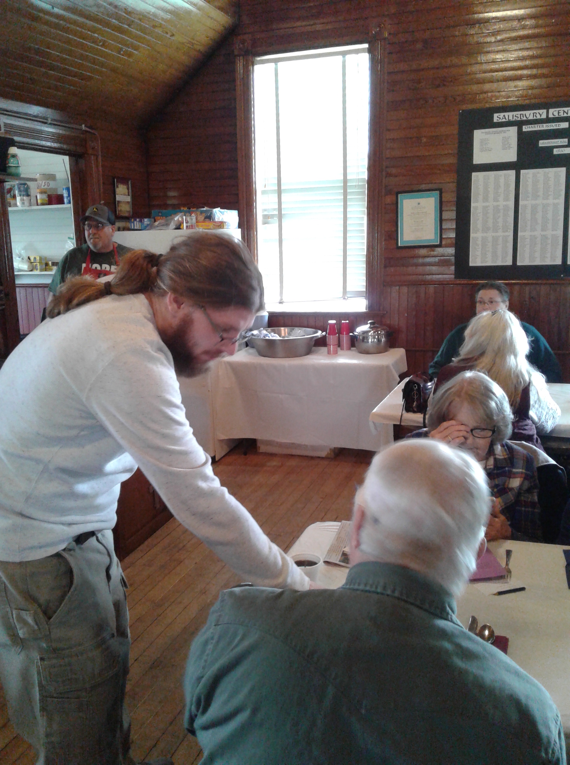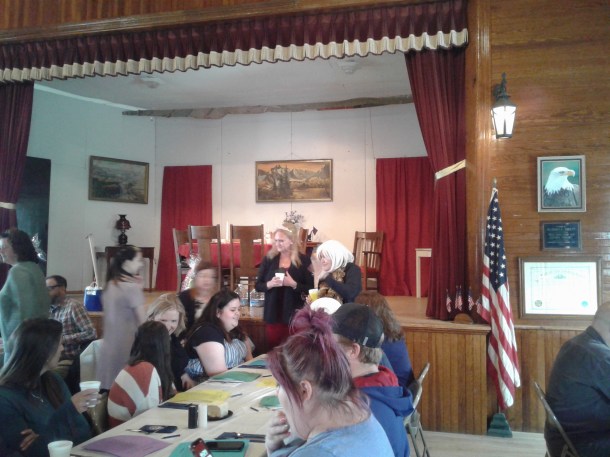 This shot shows the stage, which we only used briefly. The actors thought it would be better to stay amidst the audience, and I agreed. We have a lot of Actor’s Choice in my murder mysteries, although I reserve the right to all final decisions.