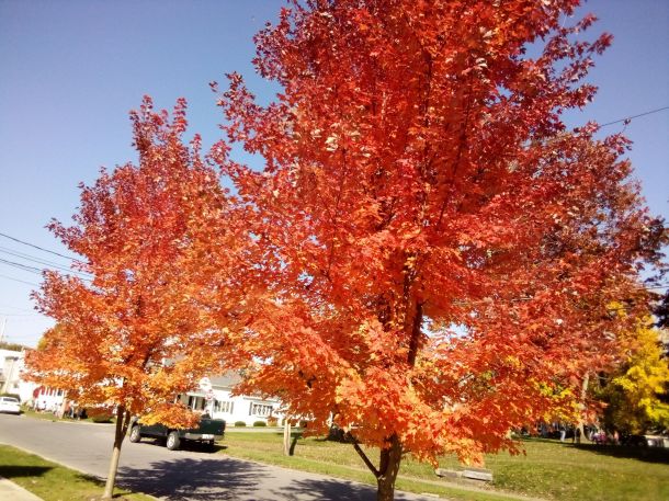 I had my phone with me, because I use the Map My Run app to track my walks and runs. It makes a map, which I post on Facebook, so my friends and family can amuse themselves and me by saying what it looks like. I had not thought to take any pictures till I paused right below a gorgeously colored tree. Would a picture come out?