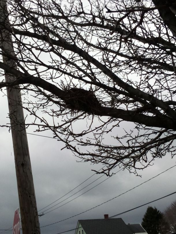 I paused to take a picture of a birds nest in a tree on Mohawk Street in Herkimer, NY (where I live) during a longish walk I took on Saturday.  So I have been getting some exercise if not running.  Incidentally, I took two longish walks in the pouring rain on Sunday (it was not raining when I left the house), which quite wore me out.  Apparently I am less resilient in my old age than I was in my younger days.  Alas!