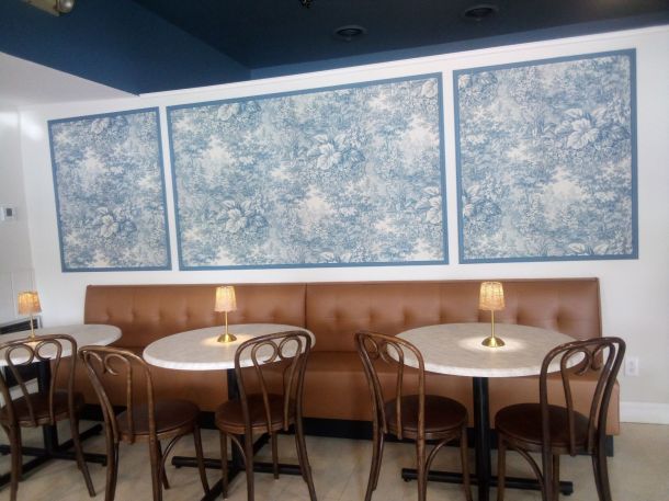 The cafe is located where the Knight Spot used to be. They were open only for ice cream for the longest time and finally opened indoor seating. They have remodeled the inside. There is less seating than when it was the Knight Spot, but it is charming. I ordered a coffee and an everything bagel with fancy toppings, then sat at a tall table (regular readers know I have a thing for tall tables).