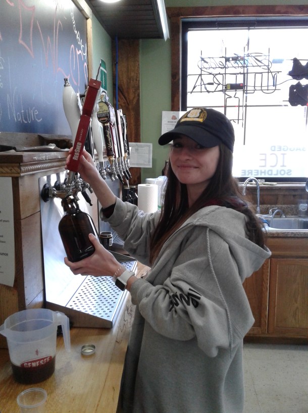 So there I was, feeling too tired to make a blog post.  I went to my pictures, wondering if I could come up with something, and my thumb accidentally hit this delightful shot.  This is Emily at Beer Belly Bob’s Discount Beverage in Ilion, NY.  She is pouring us a growler, which we purchased after a tasting recently.