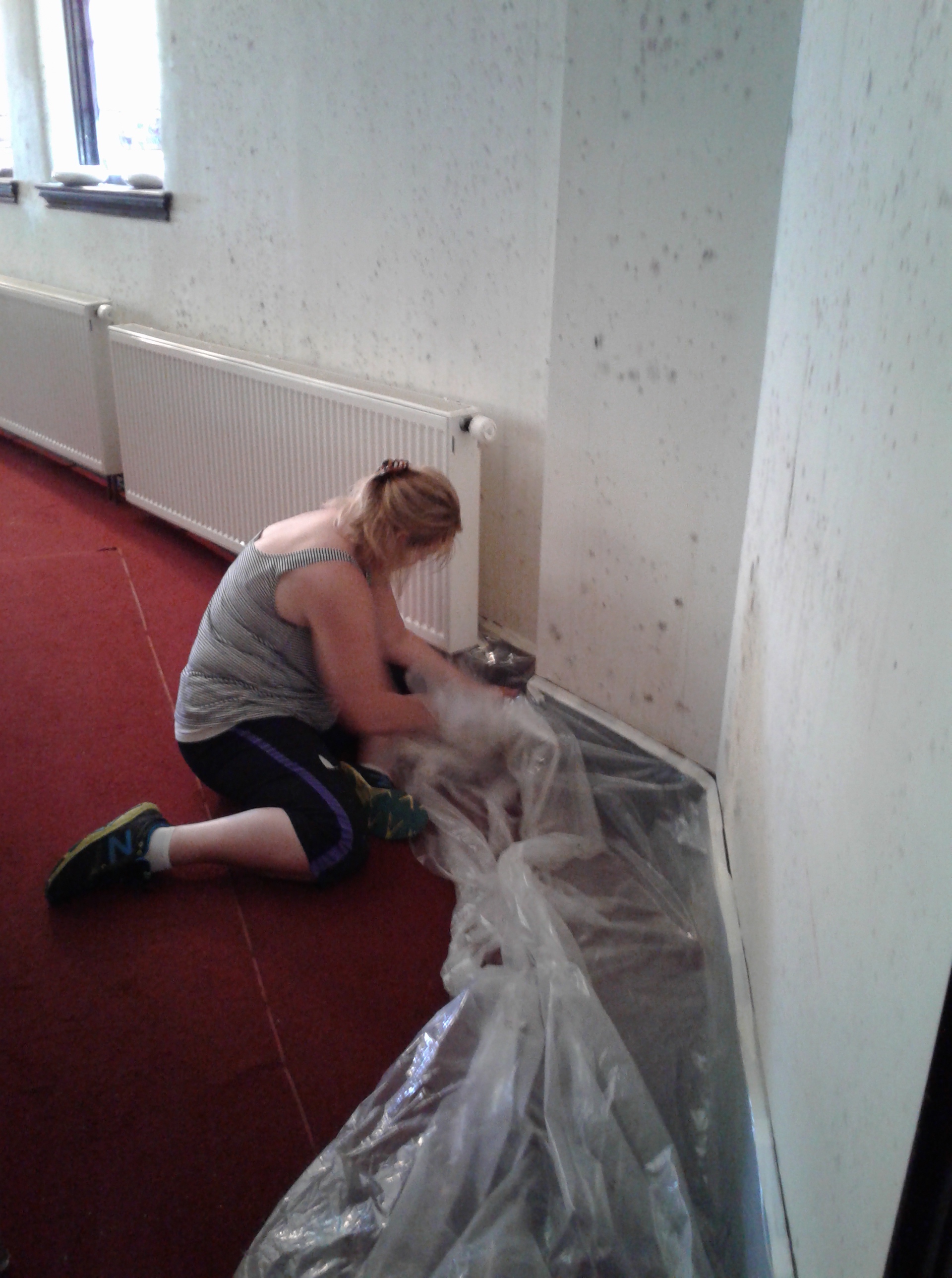 Another volunteer was placing plastic to protect the carpet prior to squirting bleach onto the walls. I squirted some bleach. I was ready to apply some elbow grease, but the other lady suggested I just spread the bleach around and leave it to soak in. Yes, sometimes time is better than effort. That is the principle I apply when I leave my dishes to air dry.