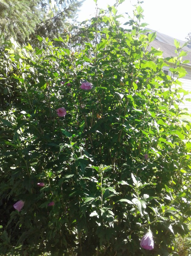The picture I took of our Rose of Sharon earlier this week was rendered problematic by the placement of the sun. Today I got out in the morning, when the sun was conveniently placed on the other side of the house.