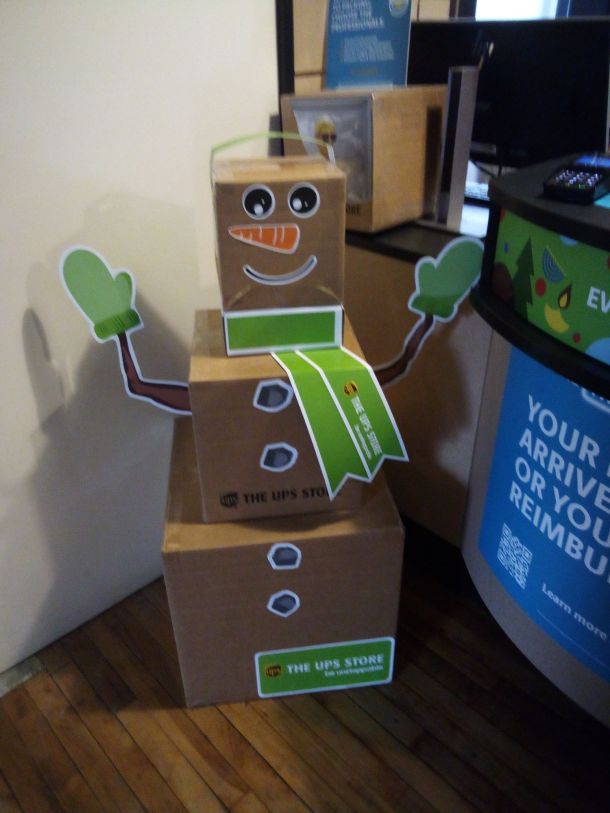 Although, now that I look at him, I wonder if corporate didn’t send out the mittens, buttons, etc, for the employees to cut out and use to make the snowman.  Is there just such a snowman at UPS Stores nationwide? Oh well, it is still cute.