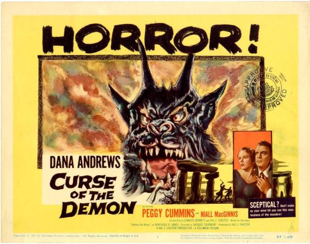 I’ve seen Curse of the Demon a couple of times, DVR’d from TCM. According to pre-movie commentary by Ben Mankiewicz, producer Val Lewton did not want to show the monster right away but was overruled by the studio. I agree that it would have been much scarier to see the first victim looking utterly horrified by… what? But these were pre-Jaws days.