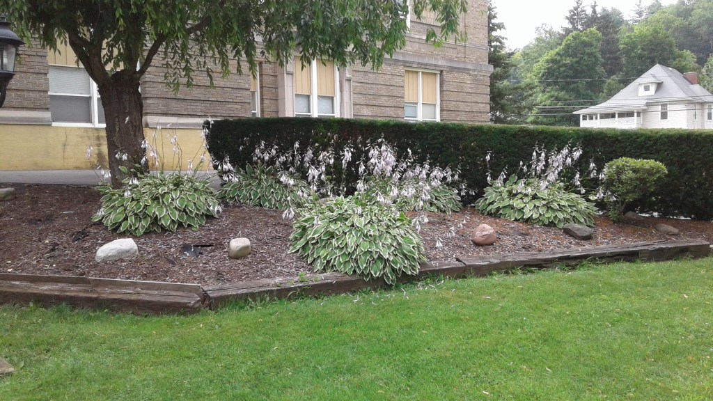 Full disclosure: I still have not upgraded my WordPress account so cannot add new pictures. Here is one from a walk I took in July 2017, making this a Way-Back Wednesday as well as a Pedestrian Post. This is the extent of my ability to multi-task (unless cleaning my oven while I sleep is still a thing) (older readers get that). Fuller disclosure: I did not see this on this morning’s walk, although I did walk by this building. For one reason, it was still dark. However, if I had troubled to look, I could probably report on whether the purple flowers are there once again. I did not. Judge me if you are so inclined.