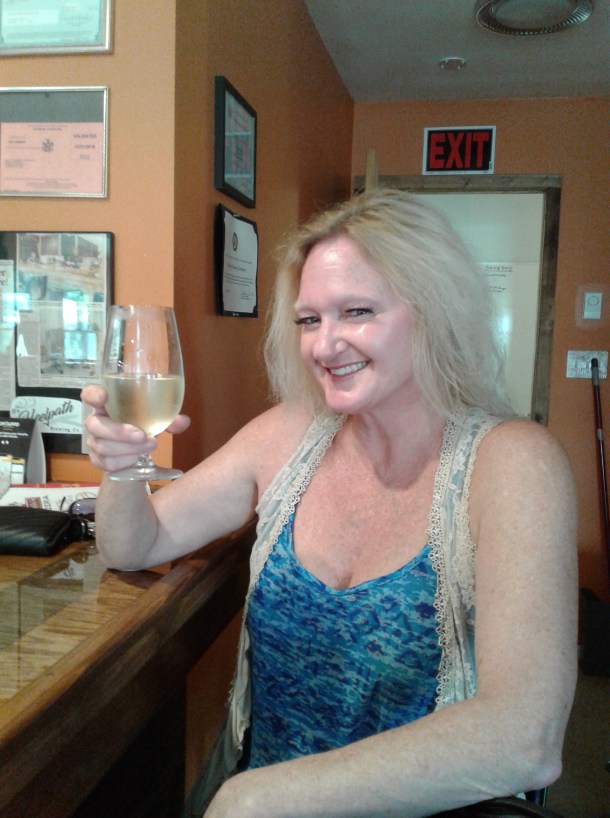 And here I am, along with Jeff, the proprietor.  I am drinking Untamed Red, from Rustic Ridge.  Kim’s is Sweet Little Blond, appropriately enough.