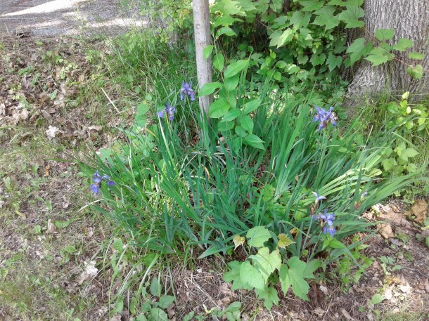 Full disclosure: I had to move a bunch of junk off the end of the couch, or this picture would have been really cluttered. Of course that might have made it more interesting as well as being a more accurate depiction of How I Live. But I decided to try to make it a cleaner picture. I suppose pictures are like potato chips; nobody wants just one. I had been meaning to take a picture of some smaller irises in my yard anyways, so I stepped outside to do so.