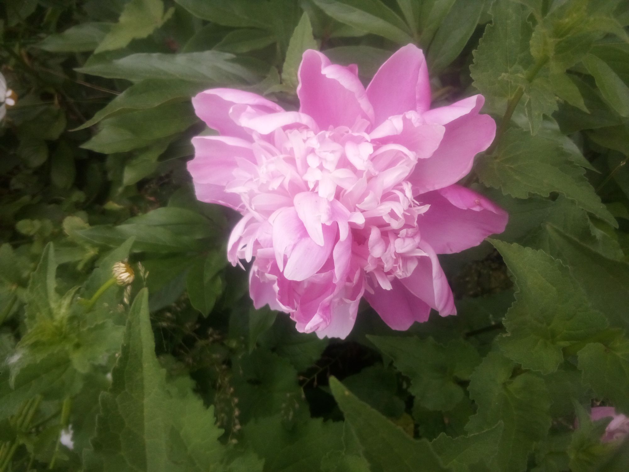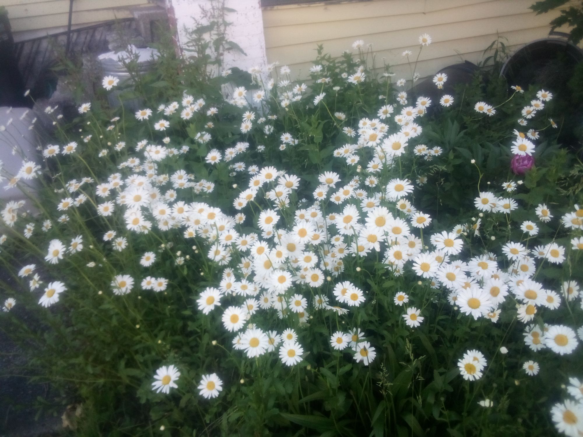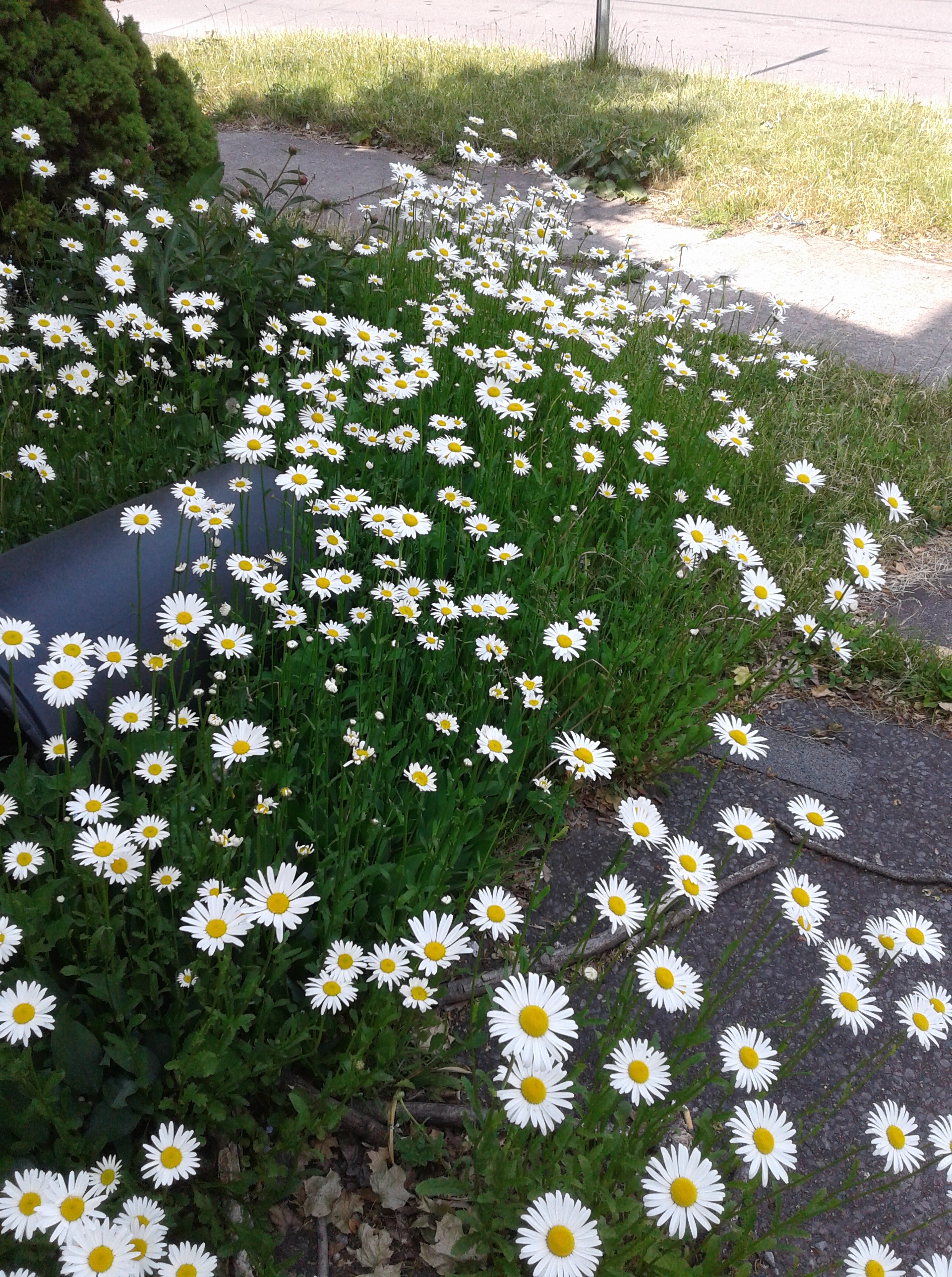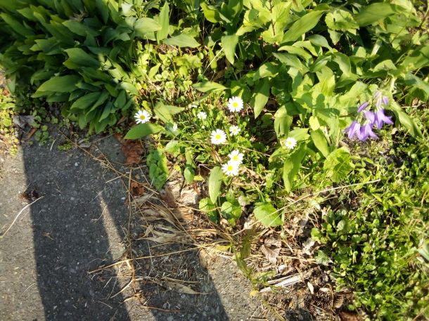I had chopped down the wild daisies that were taking over the front lawn, after it seemed they were done blooming, but I noticed a few little ones popped back up, adding another cheery note. I need all the cheer I can get.