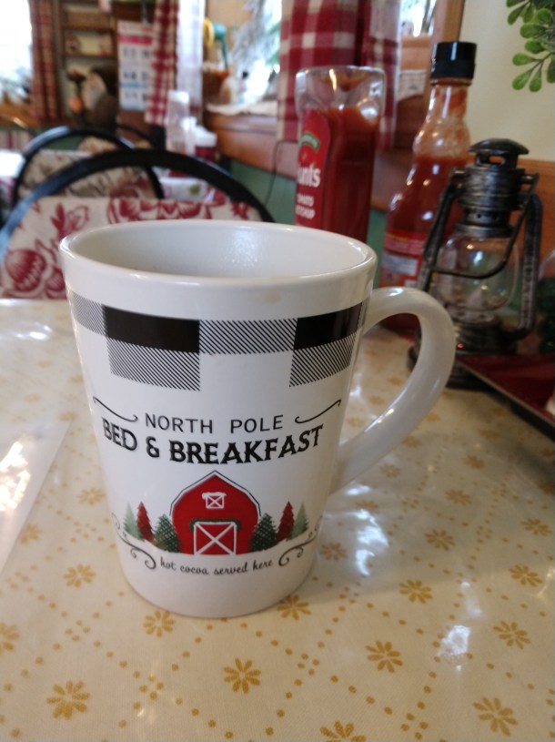 It turns out to be a little crowded but a very good place to eat. The atmosphere is homey and the decor is fun. Vintage tins and other decorations are on a shelf that runs around the wall just under the ceiling. Old-fashioned wooden games sit on the window sill and some of the tables. I especially admired a hand-embroidered tablecloth on one of the tables. The waitress told me the original owner had done it, as well as most of the other decor.