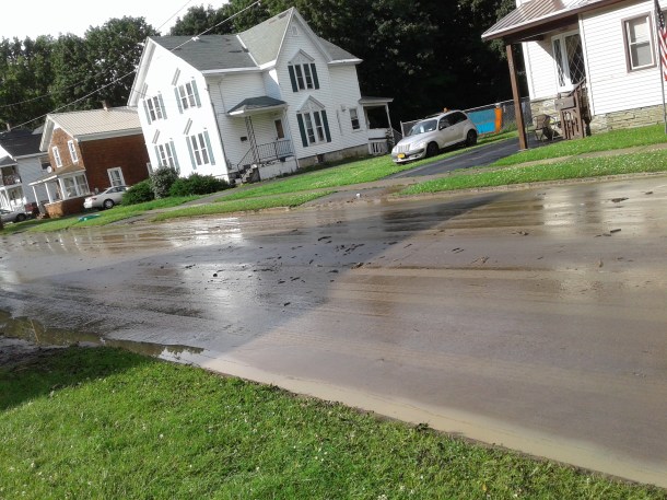 I tried to download some pictures from Facebook to share but had no luck (some laptop issue I’ll have to figure out, I suppose).  So I thought I’d use my Tablet and take a couple of pictures of Herkimer (where I live).  When I had looked earlier out the road was not a river, as it had been in 2013, but the gutters were widening and looking brown.  By the time I took the pictures, it had stopped raining and the puddles had receded, but there was debris in the road.