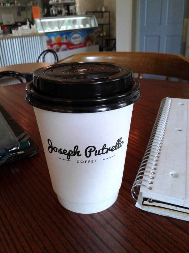 I thought about getting ice cream instead, since it was so hot out, but the lower calorie count won. To tell myself it was not really ice cream but frozen yogurt would be mere quibbling. Additionally, this is coffee by local roaster Joseph Putrello, and it is excellent coffee.