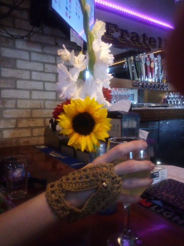 The thought of a hot beverage overcame me. The above picture was taken a couple of summers ago, when Brookwood Market was still a thing. I forgot which vendor I got the flowers from, but the fingerless gloves are from Herkimer Handknits. I can’t find a website or Facebook page for it, alas. I also have a beautiful shawl I purchased from her.