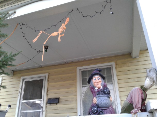 I have not finished my decorations. Witchy is not plugged in yet, but doesn’t she look cheerful? The scarecrow has been there for a while now. I must find a better spot and pose for him.