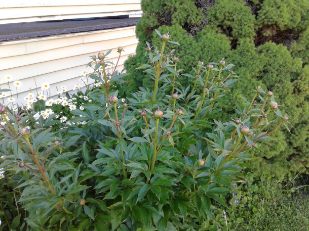 In front of the daisies is a peony bush that magically appeared after we had sufficiently discouraged the wild day lilies.  I insisted it had been planted by my stalker, a statement that has yet to be disproved.  The peonies have not bloomed yet, but look how many buds: