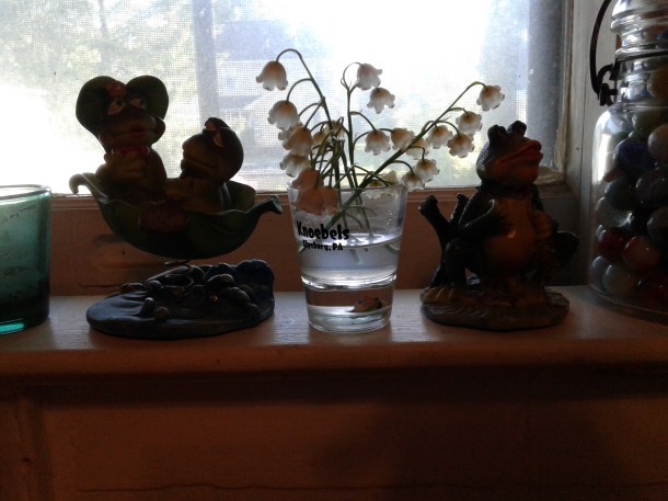 I’ve picked a few lilies of the valley and brought them inside.  I used a shot glass for a vase, because they are so small (Steven collects shot glasses, although we rarely do a shot of anything).  I love the smell.  I tired to get a picture, but I fear they were backlit and do not show.