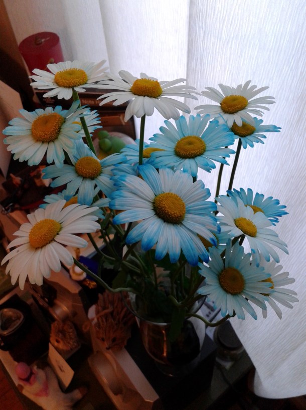 We also have some daisies inside.  Steven put them in water with blue food coloring, at my suggestion.  I think they’re pretty.