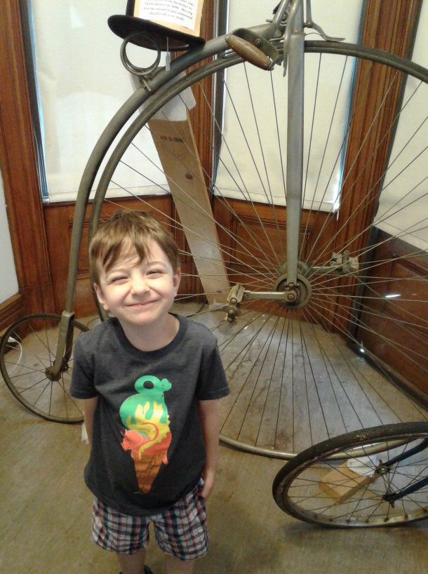 Upstairs we noted the old bicycle with the huge front and tiny rear wheels. We marveled over the fact that a man rode it right across the country.