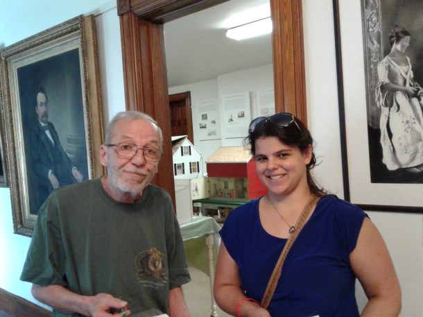 As we walked around downstairs I pointed out the ornate Remington typewriter. I have a less fancy Remington typewriter myself.. We all admired the doctor’s study with its built-in bookcases and large fireplace. The woodwork throughout the house is beautiful.