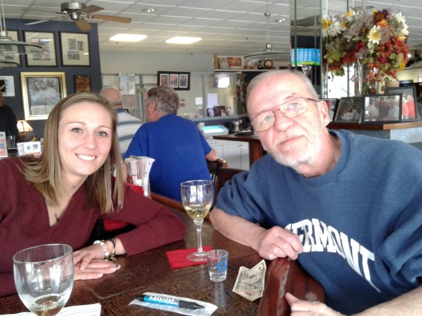 Here are Phyllis and I (I am on the left), toasting friendship at Gerber’s 1933 Tavern in Utica, NY. We were there with our husbands for lunch. Some of my best memories are getting together with Phyllis and Jim. They were also members of Ilion Little Theatre. Jim shone onstage while Phyllis helped out offstage, often acting as prompter. She and I had some good times backstage during Dirty Work at the Crossroads. At one point during the show (in an added attraction suggested by Jim), Jim was onstage singing, “Yankee Doodle Dandy.” When he got to “I’ve a Yankee Doodle sweetheart,” a young actress backstage (she was playing my daughter), would make a grand gesture toward Phyllis. Phyllis would get a huge smile on her face, acknowledging that it was her.
