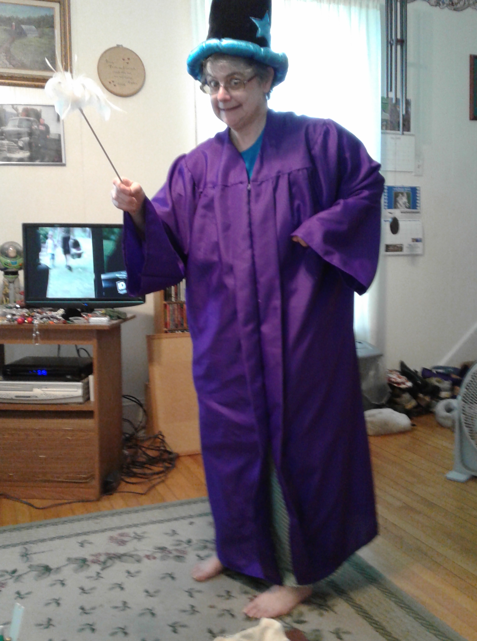 Now to figure out what kind of costume to wear… Naturally, I have many costume pieces in my attic, from my theatrical endeavors as well as my Halloween high jinks. When I suggested a wizard to Laura, she liked the idea. First I had to search my attic for my wizard hat and black-and-gold caftan. At first I could not find them, but I found a purple graduation gown, which I had purchased at a rummage sale. At the time, I had some idea of being the one-eyed, one-horned flying purple people eater for Halloween, but I haven’t done that yet. Still, if I couldn’t find the caftan, I could do something with a purple gown. Hmmm…. Then I found the hat — and the caftan! Score! I brought everything downstairs.