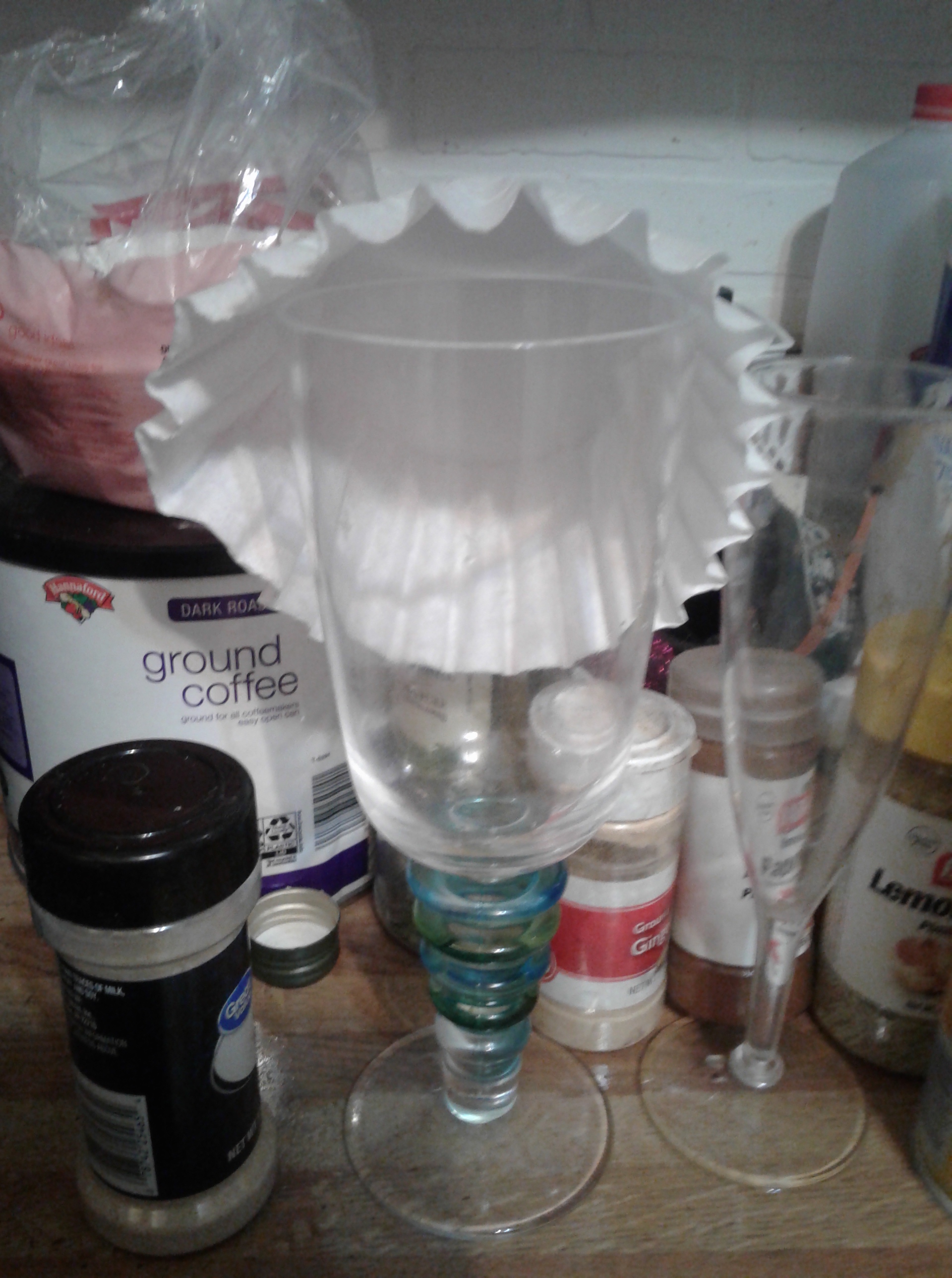 I thought it looked cute, like a bride or a lady wearing an Easter bonnet (seasonal!). I thought the champagne flute gave the tableau a festive air. The surrounding spices, coffee tin and what-not, I suppose only clutter up the image, but I must be honest in what I depict. One could argue that I was too lazy to clean things up. However, I go with my former reasoning. I figure, I liked the image because the filter accidentally fell as if the goblet was wearing it. It would add a layer of artificiality if I were to purposely clean up the surrounding area. It may be a rationalization, but I like it (thus rationalizing my rationalization).