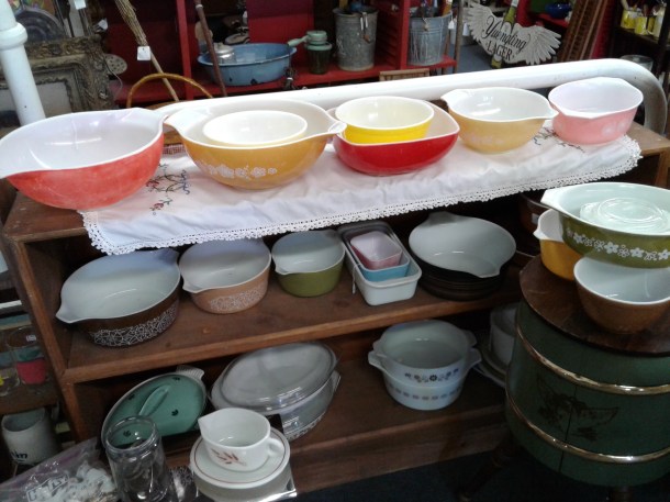 As I walked, I thought of things I could say to people who remarked on my umbrella: “It’s my parasol.” “I am protecting my dewy completion from the sun’s ravages.” Nobody said anything. After mailing the letters, I decided to walk to Mohawk Antiques Mall. For one reason, it was Customer Appreciation Day and they were serving hot dogs. Also, it is a very fun place to walk around, as there are lots of vendors.