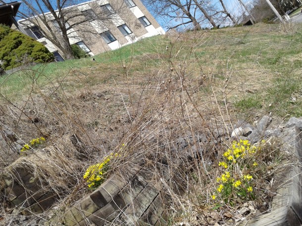 What fascinated me about these blooms was that they were surrounded by dried crap from last fall. Nobody had bothered to cultivate them, so it seemed, yet they were determined to spread beauty and happiness. Or do I credit flowers with more thought processes than they actually posses? I don’t really know about these things.