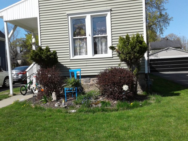 It was one of those bright, sunny days where I couldn’t really see the picture when I was taking it. The above was taken near my house. I especially liked the blue chair with a plant on it. I also liked the artwork in the windows. I appreciate people’s efforts to decorate.