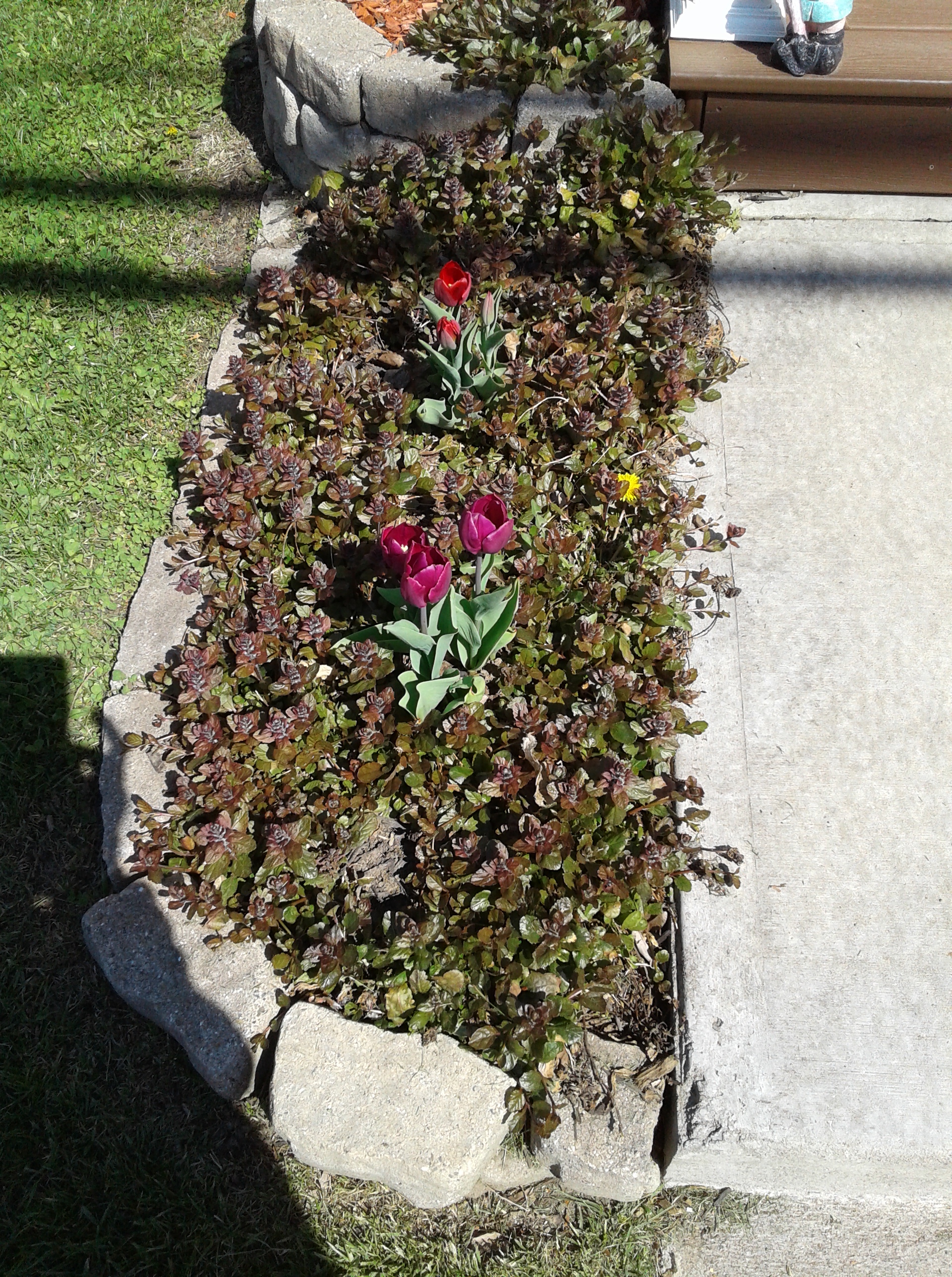 Regular readers may remember this as the house that previously hosted the Plant That Ate Bellinger Street. A couple weeks ago I took a picture of a brave daffodil brightening the area. Today I saw a few more daffodils and a couple tulips. I was delighted.