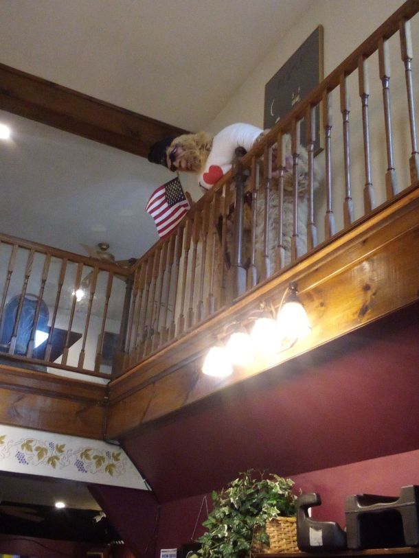 I have made several posts about Yetty’s, on Mohawk Street in Herkimer, but none recently. I was there for dinner last night and got garlic pizza. I am enjoying the leftovers today. As I left, a little boy was pointing at this lovely fellow looking over the railing. I never saw him before. Of course I stopped to take a picture.